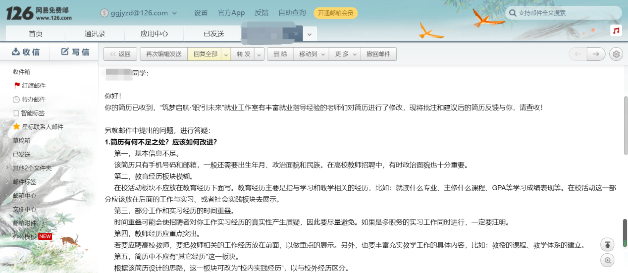 从简历整体上呈现的内容和形式来看,同学们都有着较为丰富的学习和实践经历,对简历的撰写和设计也有着初步的了解。但简历中也存在着一些共同的问题:比如简历模板不规范、板块界定不清晰、出现错别字以及内容上逻辑不通和详略失当等。评改结束之后,赵泽军和吴浩妮两位同学对批注后的简历进行了汇总与整理,并对同学们进行了“一对一”反馈。
