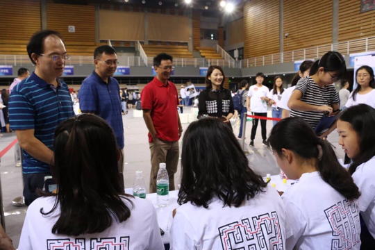 PA视讯集团官网经理谢韬,副经理王明进,副经理杨毅,团总支书记、辅导员钱梦婷,中外合作办学项目负责人屠希亮来到工作现场慰问迎新工作人员。在老师们的指导下迎新工作顺利进行。